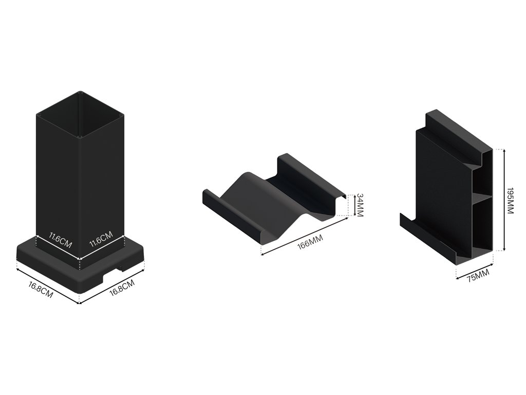 Robustní sloupek má rozměry 116x116 mm, při instalaci je zapotřebí počítat s patkou sloupku o rozměrech 160x160 mm. Patka je z 8 mm silné oceli a je navíc zakryta hliníkovým krytem (165x165 mm) s integrovaným drenážním systémem. Vyvýšený hliníkový profil s přidanou horní lištou ukrývá lamely tak, že z bočního pohledu nejsou viditelné a jsou v jedné linii s profilem.