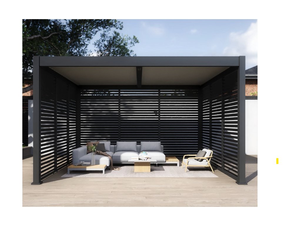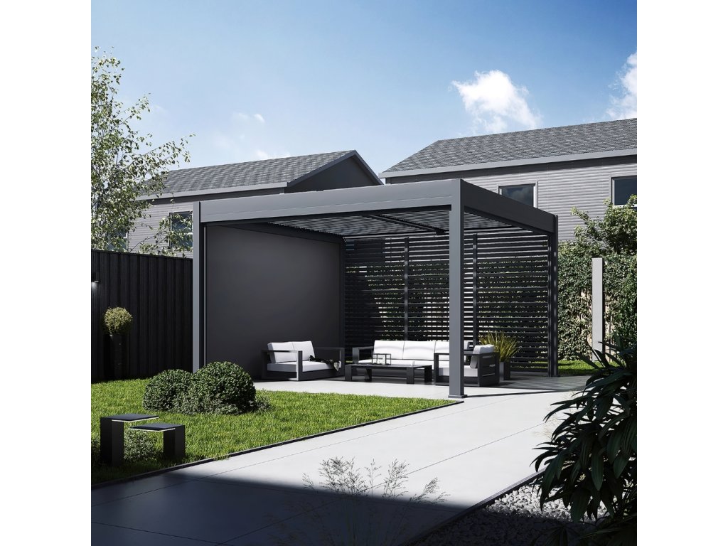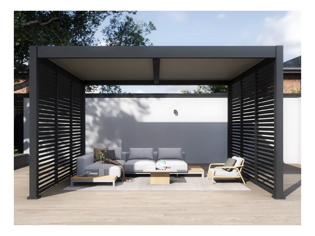 Kteroukoliv stranu pergoly lze doplnit o zástěnu. V nabídce máme čtyřmetrové zástěny s hliníkovou konstrukcí a výplní z textilenu, které poskytnou ochranu před větrem a zároveň vytvoří příjemný stín. Pergolu je také možné doplnit o stínicí panely s fixními či sklápěcími horizontálními lamelami pro dodatečné soukromí a zastínění.