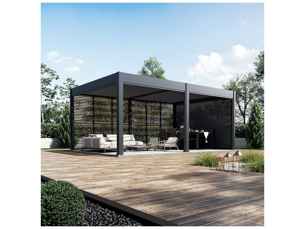 Kteroukoliv stranu pergoly lze doplnit o zástěnu. V nabídce máme třímetrové a čtyřmetrové zástěny s hliníkovou konstrukcí a výplní z textilenu, které poskytnou ochranu před větrem a zároveň vytvoří příjemný stín. Pergolu je také možné doplnit o stínicí panely s fixními či sklápěcími horizontálními lamelami pro dodatečné soukromí a zastínění.