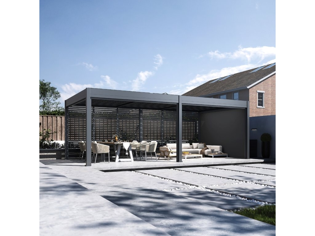 Kteroukoliv stranu pergoly lze doplnit o zástěnu. V nabídce máme různé rozměry zástěn s hliníkovou konstrukcí a výplní z textilenu, které poskytnou ochranu před větrem a zároveň vytvoří příjemný stín. Pergolu je také možné doplnit o stínicí panely s fixními či sklápěcími horizontálními lamelami pro dodatečné soukromí a zastínění.