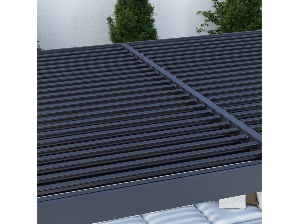 Velmi pevná a stabilní konstrukce v antracitové barvě RAL 7016, v matné povrchové úpravě se hodí do každého prostoru, není zapotřebí vrtat do stěny. Pergola je vyrobena z vysoce kvalitního hliníku, který je ošetřen práškovou barvou, což zaručuje odolnost vůči povětrnostním vlivům.