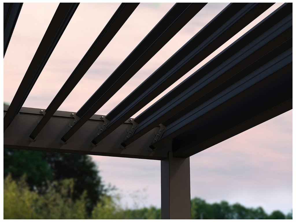 23 nastavitelných otočných lamel Vás ochrání nejen před sluncem, ale i před deštěm. Lamely lze otáčet od 0°, kdy docílíte úplně uzavřené střechy až do 135°, díky čemuž získáte skvělou mobilitu a možnost zastínit slunce z jakékoliv strany.