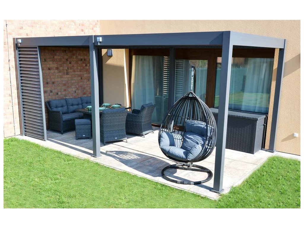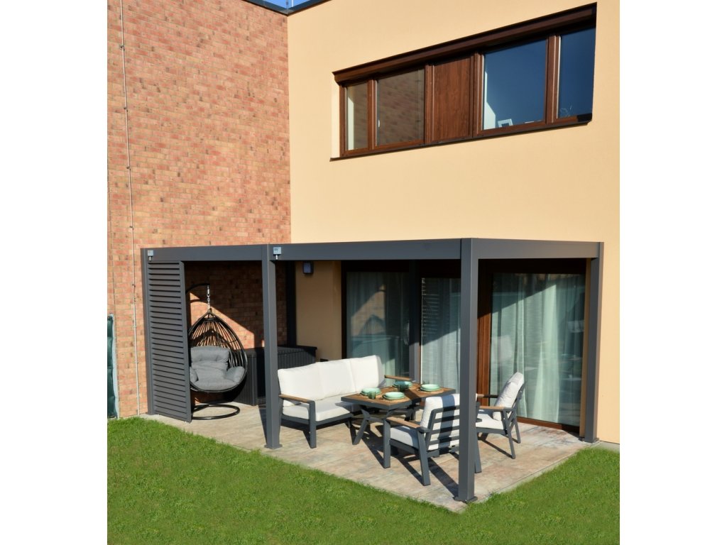 Pergolu lze doplnit o zástěnu. V nabídce máme třímetrové zástěny s hliníkovou konstrukcí a výplní z textilenu, která poskytne ochranu před větrem. Pergolu je také možné doplnit o stínicí panel s fixními horizontálními lamelami pro dodatečné soukromí a zastínění.