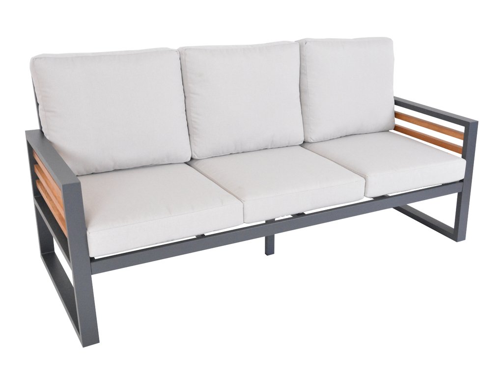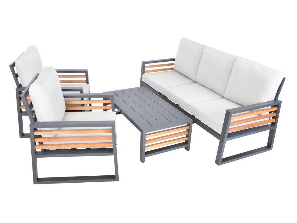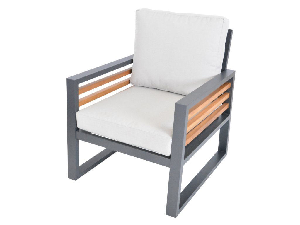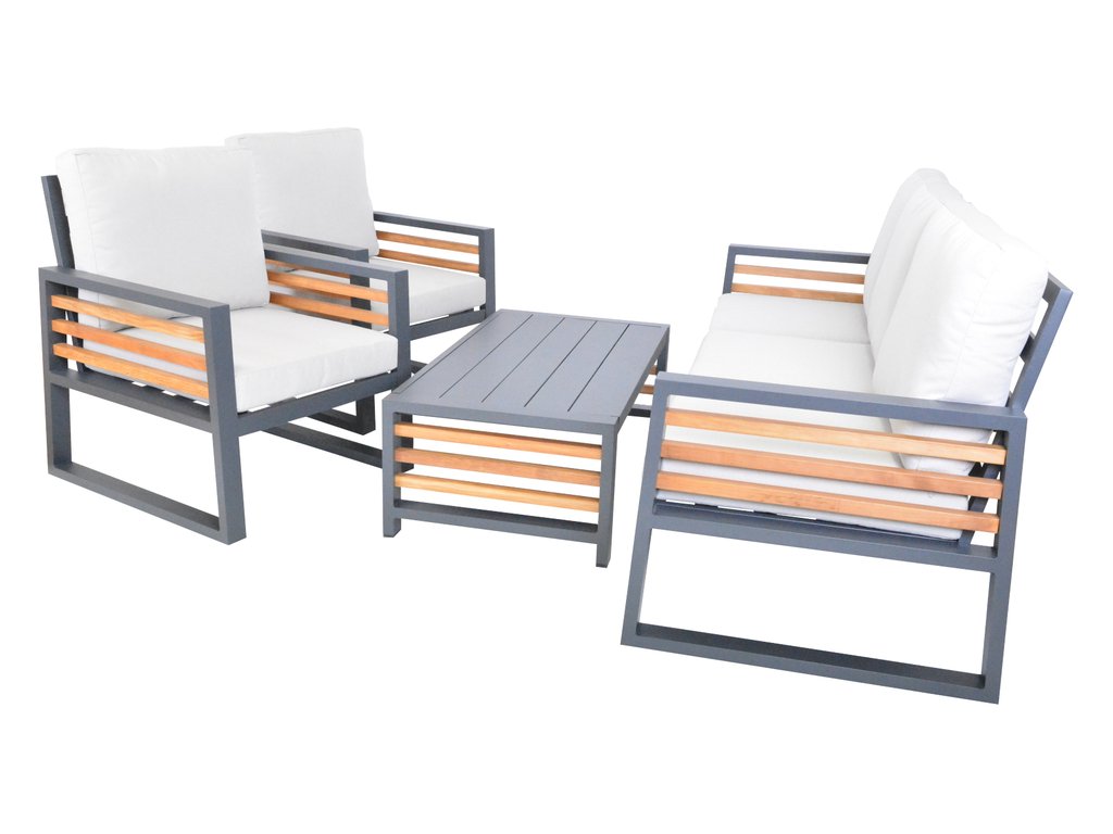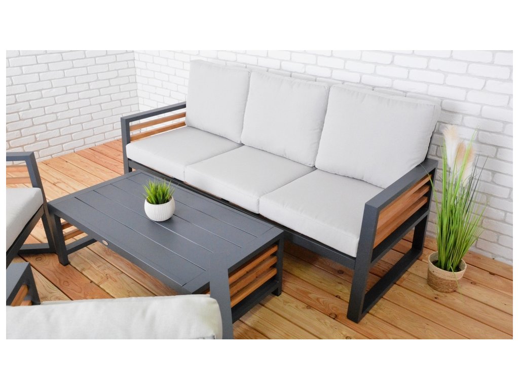 Luxusní hliníková souprava v grafitovém provedení, dřevěné výplně ošetřené pryskyřící jsou z novozélandské borovice a natřené voskovým olejem pro delší životnost. Moderní souprava, která skvěle zapadne do každého exteriéru či interiéru.