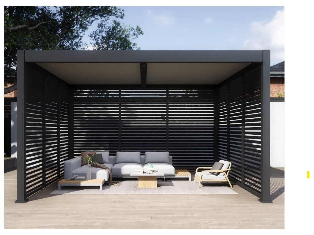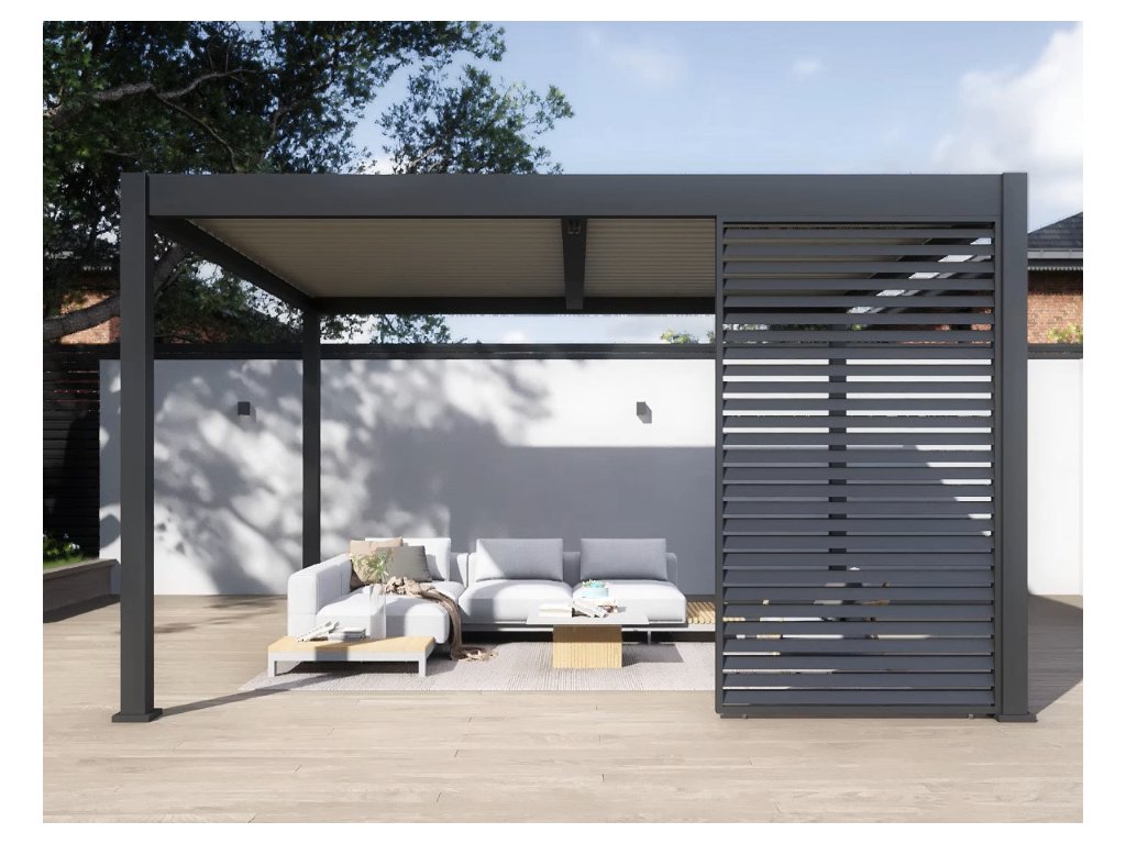 Pro maximální využití bioklimatických pergol nabízíme také příslušenství v podobě panelu s horizontálními fixními lamelami pro zastínění bioklimatické pergoly a získání většího soukromí.
