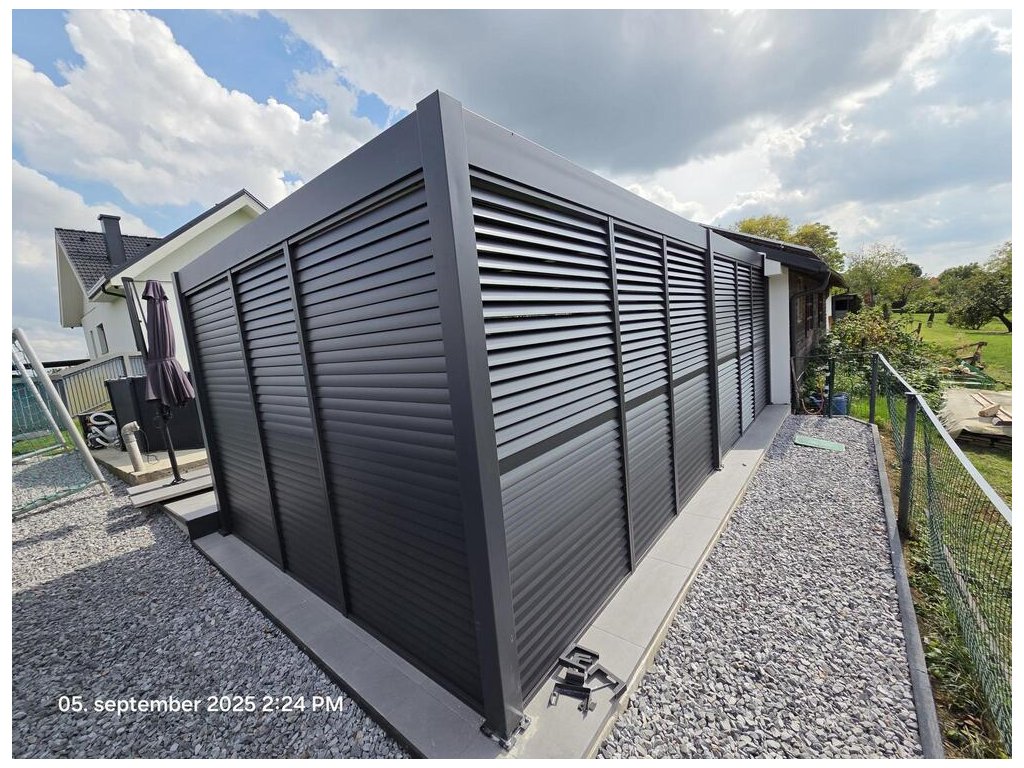 Pro maximální využití bioklimatických pergol nabízíme také příslušenství v podobě panelu s horizontálními sklápěcími lamelami pro zastínění bioklimatické pergoly a získání většího soukromí.