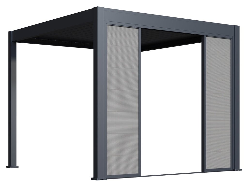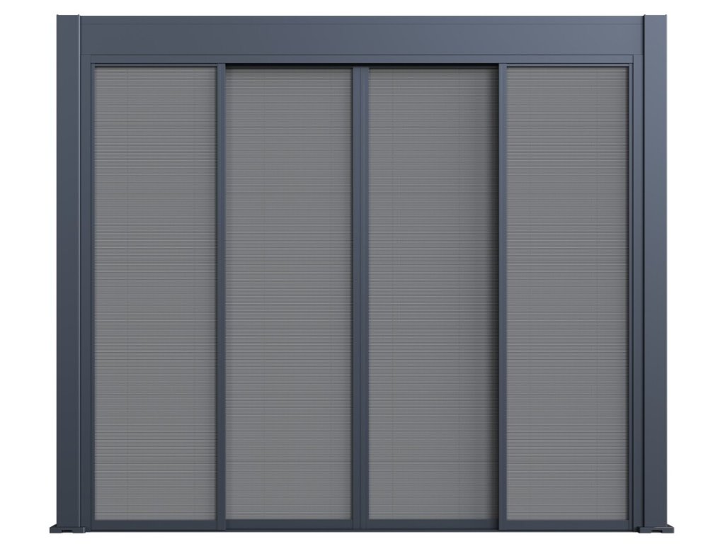 Pro maximální využití bioklimatických pergol nabízíme také příslušenství v podobě posuvné zástěny s hliníkovou konstrukcí a výplní z textilenu, která poskytne ochranu před větrem, zároveň vytvoří i příjemný stín.