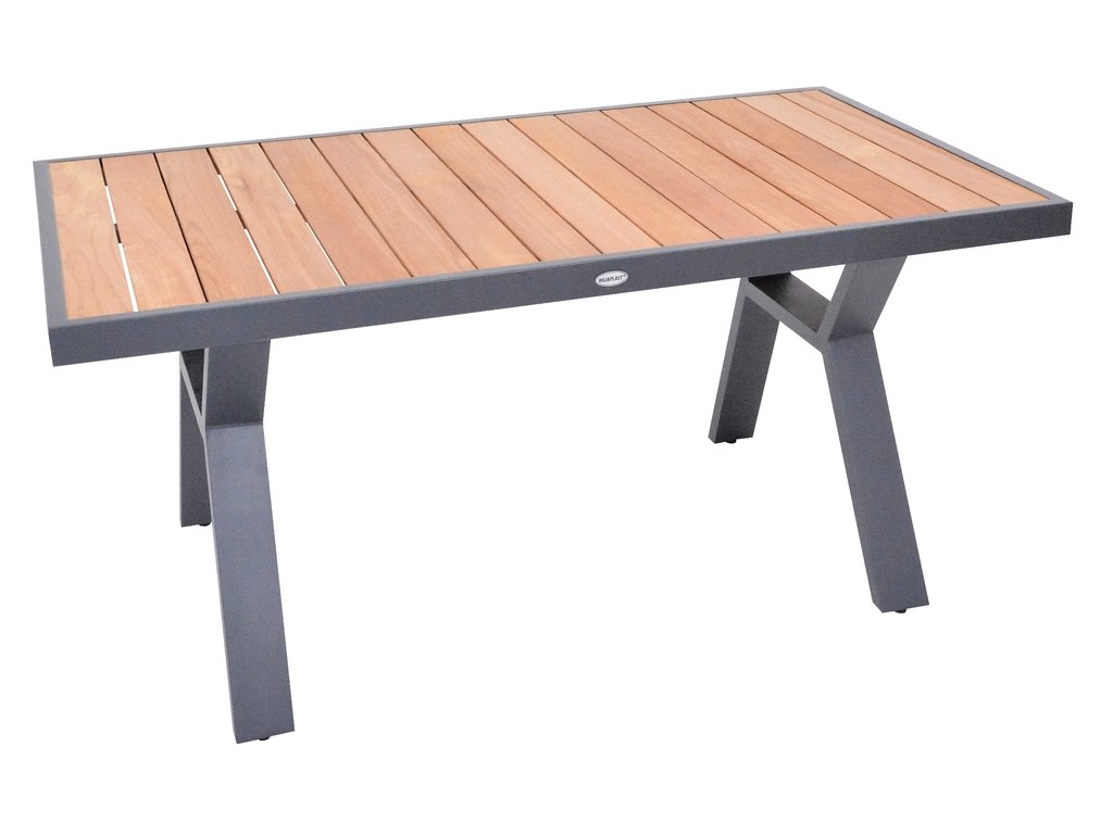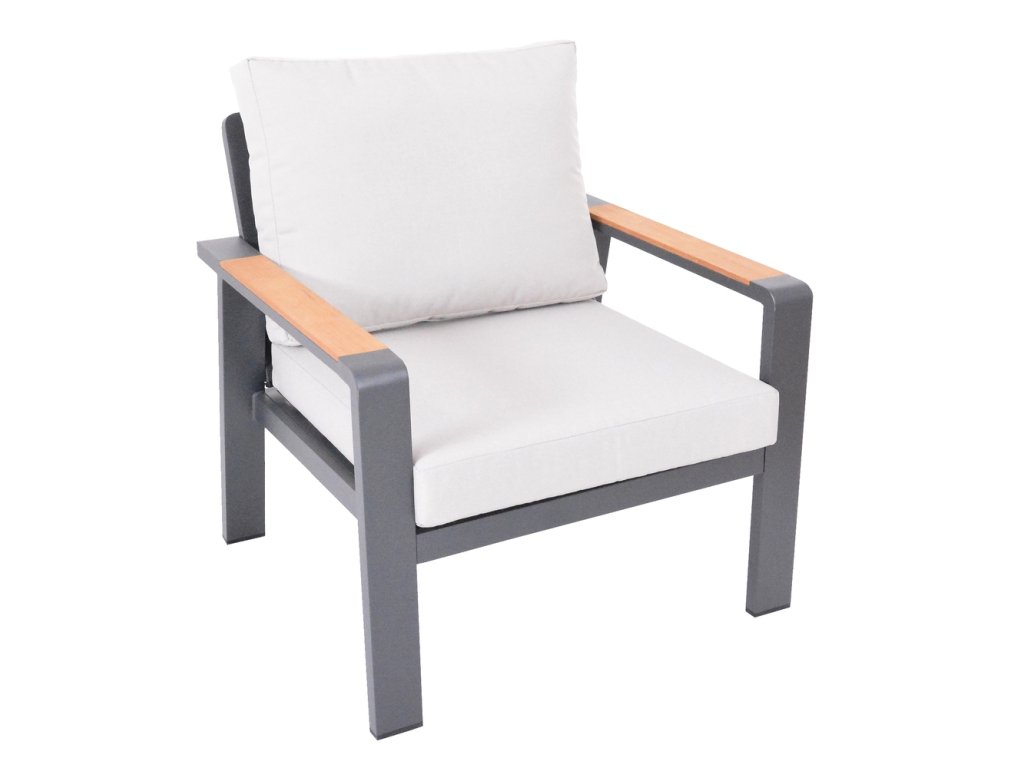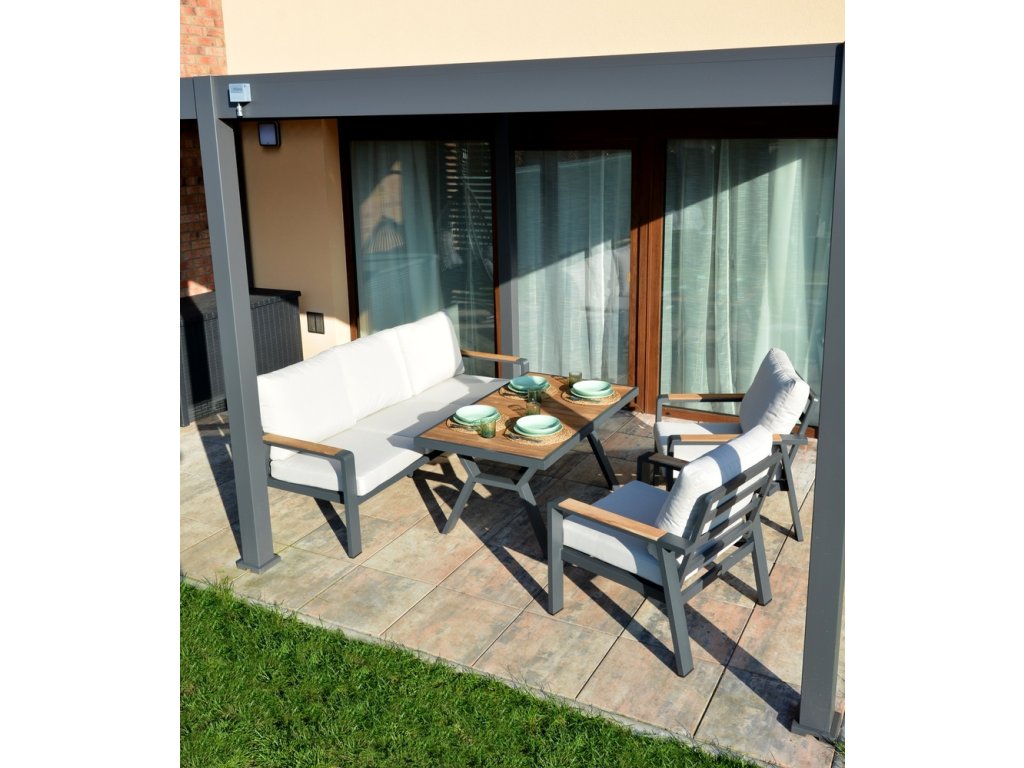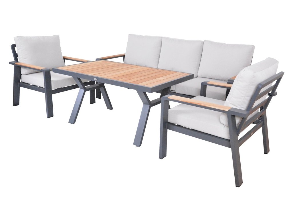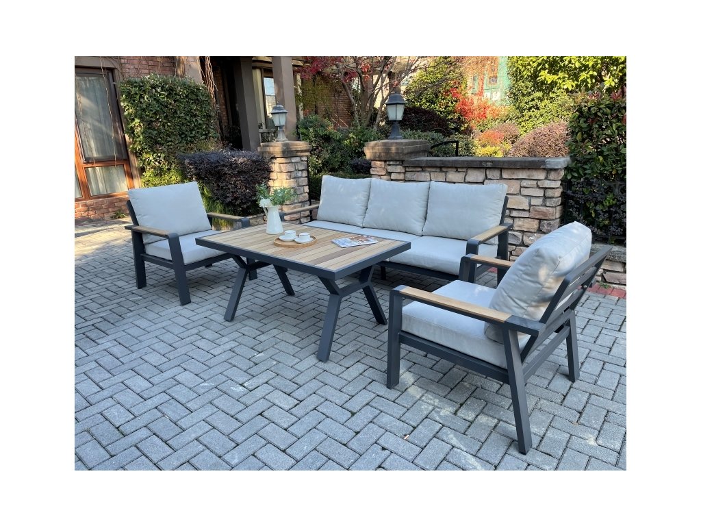 Luxusní hliníková souprava v grafitovém provedení, doplněna o teakové područky a desku stolu. Moderní souprava, která skvěle zapadne do každého exteriéru či interiéru.