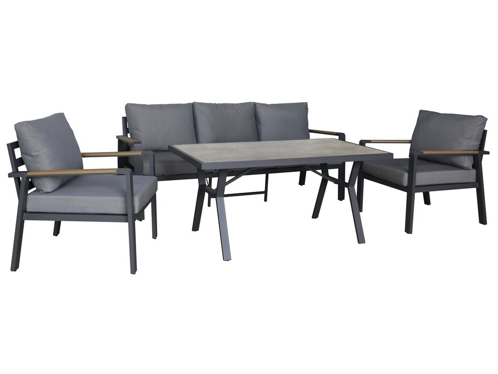 konstrukce grafit, područky z polywoodu v barvě dřeva, tmavě šedé podušky, tmavě šedá stolová deska v dezénu kamene