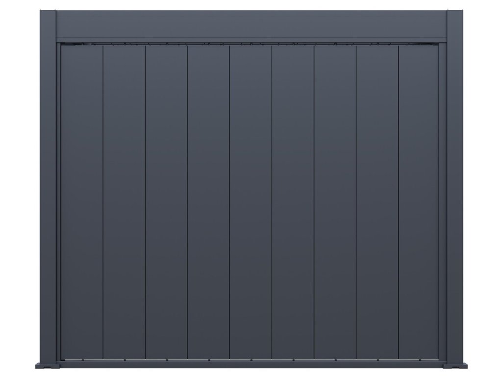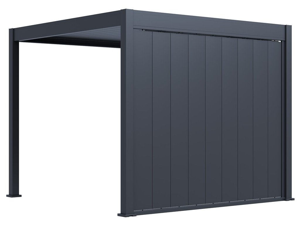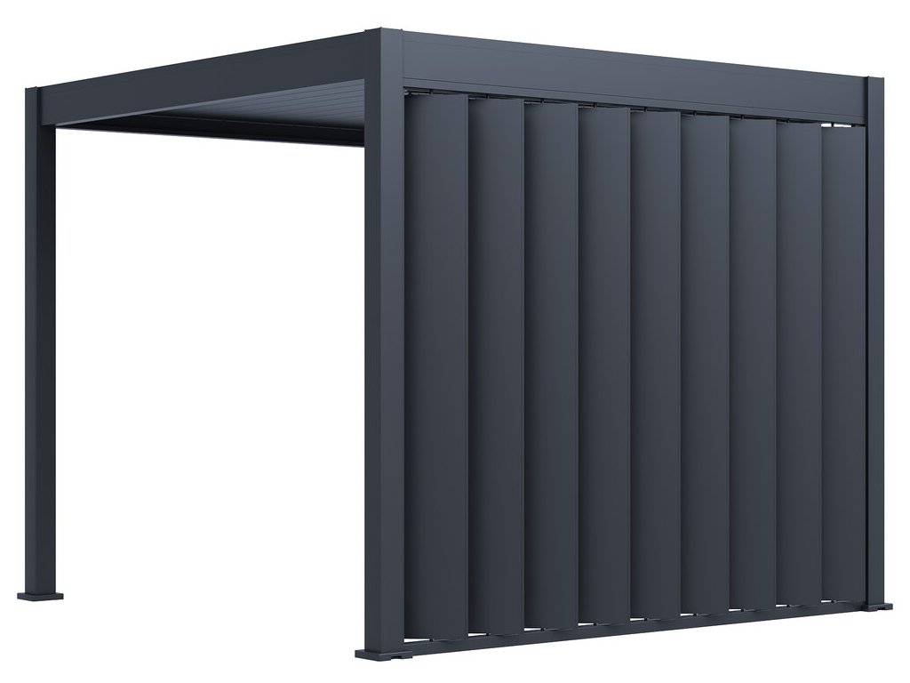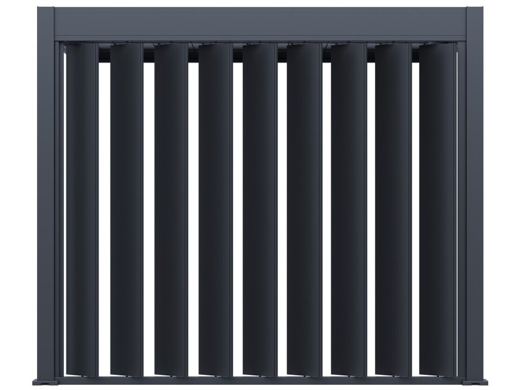 Pro maximální využití bioklimatických pergol nabízíme také příslušenství v podobě stěny s vertikálními sklápěcími lamelami pro zastínění bioklimatické pergoly a získání většího soukromí.